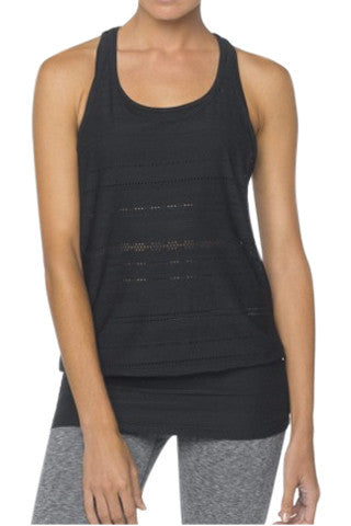 Prana Ambrosia Tank is a relaxed fit with a tunic length. Performance mesh dries quickly and keeps you breathing easily. A wide self band at the hem is both flattering and keeps it in place during a workout.